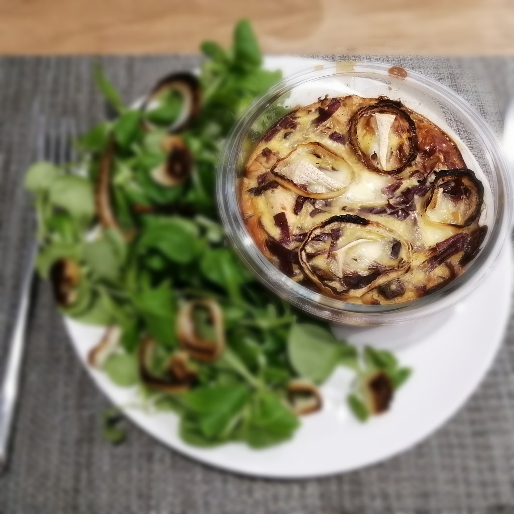 Pour 1 quiche individuelle (je préfère de toutes façons compter pour une personne, l’appli ww n’étant pas maline pour gérer les arrondis). À manger chaud ou froid avec de la salade ! Ou des haricots verts, ça irait sûrement bien aussi.