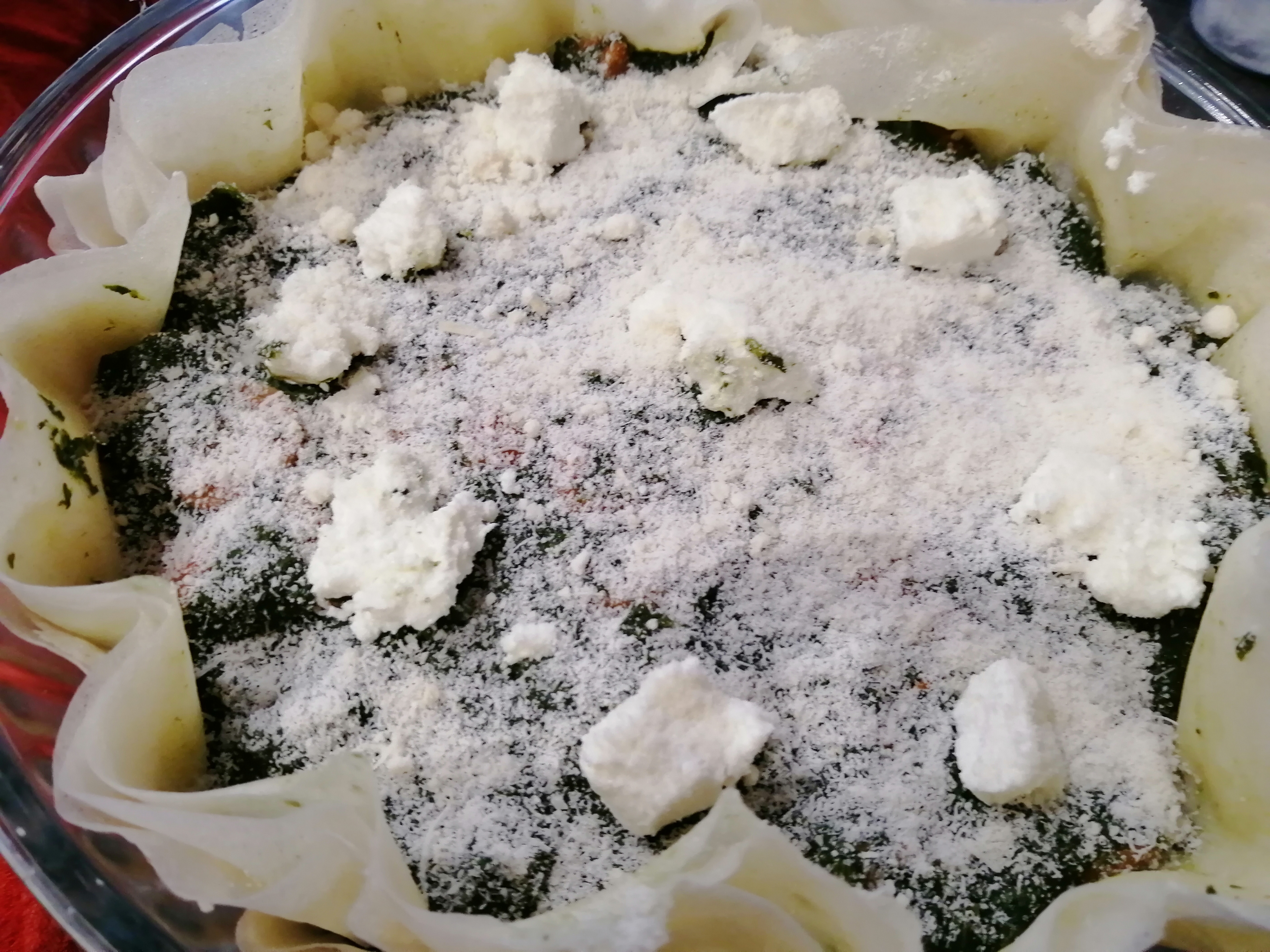 4) disposer les 3 feuilles de brick restantes puis recouvrir avec les légumes restant, le carré frais émietté, le parmesan râpé.