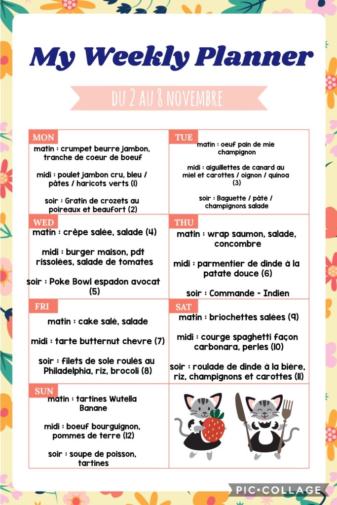 Non, niet, no way! Parce que sinon on sera toujours reconfinés et vivant une période difficile mais en plus on se sera éloigné de notre objectif et on se sentira coupable. Aucun intérêt ! Alors hop hop on retrousse ses manches et on prépare son menu de la semaine 😁 100% télétravail pour moi donc tous les repas sont planifiés. C’est sujet à modification selon le temps / les envies / les restes, surtout le petit dej, mais ça fait une bonne trame 🧘
