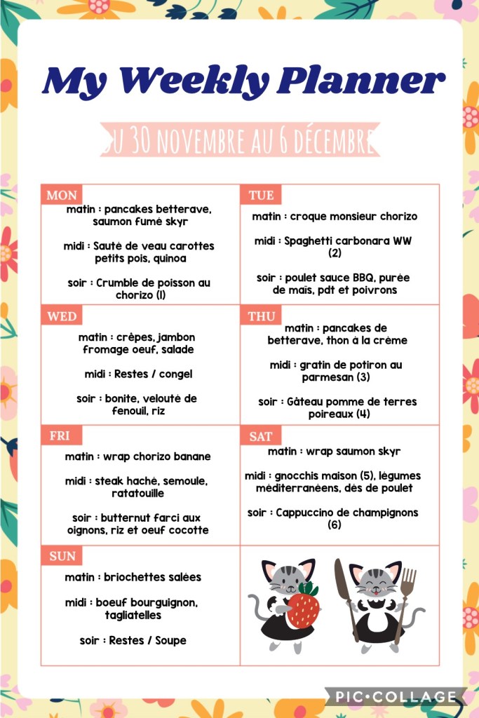 Coucou le internet ! J’espère que ce billet vous trouve de bonne humeur, autant que possible dans ces conditions ! De mon côté je vais mieux, j’ai la pêche ! Cette semaine un menu raisonnable sans consommation de RH après deux semaines avec excès 😁 les recettes sont sous la photo, suivez les numéros !