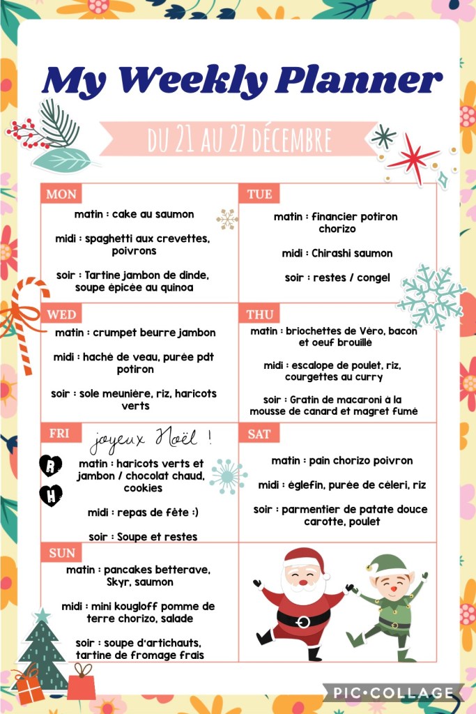 Ho ho ho ! On dirait que je me recale, on est vendredi ! Serait ce le miracle de Noël en action ? Quoiqu’il en soit, voici le menu de la semaine prochaine ! Avec mes repas de fête 🤗