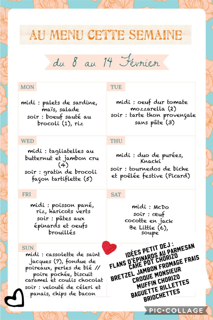 C’est déjà vendredi ! Pour vous aussi les semaines passent à une vitesse folle ? J’en perds toute notion du temps… Mais pas l’appétit 😋 allez on se penche sur le menu de la semaine prochaine ! Les liens vers les éventuelles recettes sont en dessous.