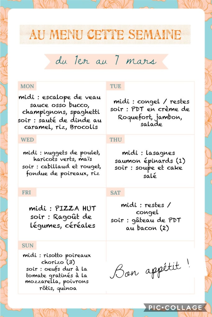 Et voilĂ ! En petite touche bonus je compte faire un banana bread cannelle chocolat (http://chezgourmandine.fr/bananabread-cannelle-pepites-de-chocolat/), peut ĂȘtre des palets de lĂ©gumes (https://www.audecuisine.fr/post/palets-de-l%C3%A9gumes-carottes-poireaux) et des cannelĂ©s… https://www.cuisineactuelle.fr/recettes/canneles-aux-piquillos-et-chorizo-223580 mais version + light đ€