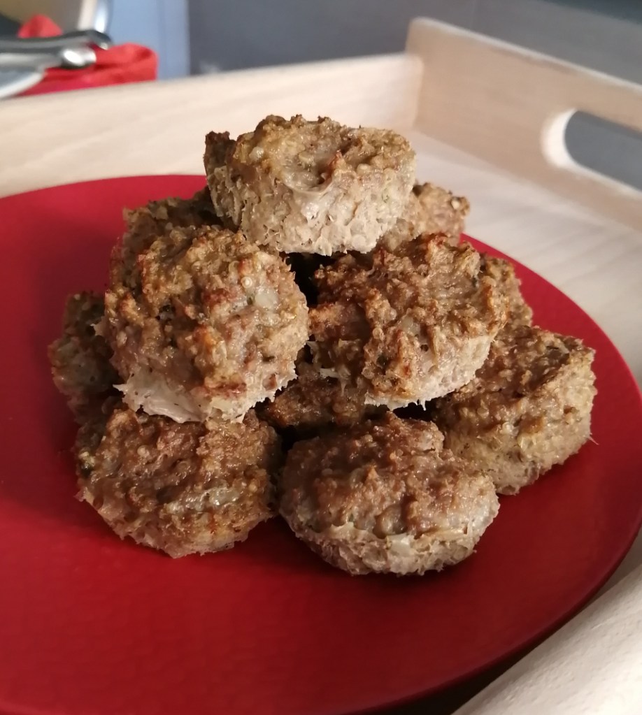Parce que c’est un peu mou et que je ne voulais pas les cuire dans l’huile, j’ai utilisé des moules à mini muffins ! J’en ai obtenu 26, j’ai indiqué 4 personnes mais selon l’utilisation la portion va varier…